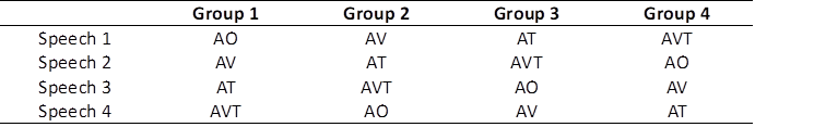 This is a within-subject study in which each participant performs all four SI tasks from English (L2) to Chinese (L1) in different conditions: AO, AV, AT, and AVT. The participants were randomly assigned to one of the four groups, each group performing four SI tasks in four conditions (see Table 2). The order of the four speeches was balanced across the 30 participants in a Latin square design.
