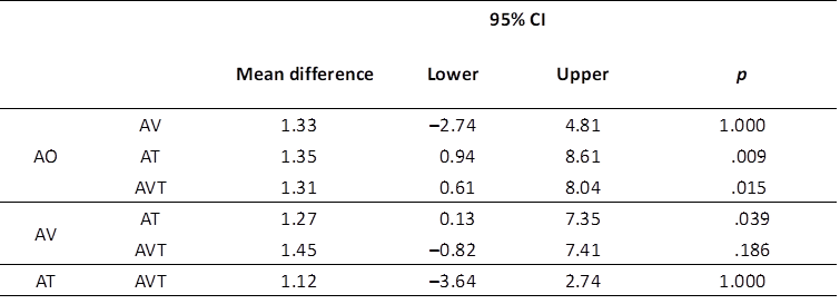 A closer inspection of the subscales of cognitive load found that differences exist in every subscale (Table 6). This means that the participants experienced the lowest mental load and felt the most successful in the AT condition. They devoted the most effort in the AO condition and experienced the most frustration in the AV condition.