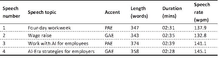 All four speeches were similar in terms of topic, structure, delivery rate, and duration, which was approximately three minutes each. Prior to recording their speeches, the two speakers were asked to familiarize themselves with the speech texts. For the purposes of the recording, they were asked to deliver the speeches as if addressing a live audience, aiming for a natural and engaging delivery style and avoiding mechanical word-for-word reading. Table 1 below provides the details of the properties of the four speeches.