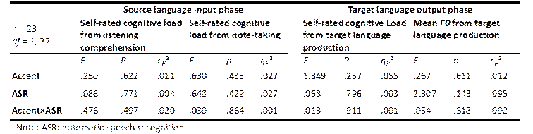 One participant’s data were not accepted for analysis due to the failure to record their interpreting performance. Repeated-measures ANOVAs were carried out on different indicators of interpreting performance and cognitive load separately, with accent and ASR assistance as within-subject factors. Greenhouse-Geisser correction was adopted to obtain the adjusted critical values when an assumption of sphericity was violated. When significant interaction between the two factors was found to exist, simple effect analysis would be conducted with Bonferroni correction applied.